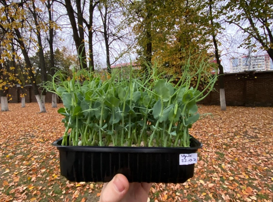 Растущий бокс микрозелени гороха размером 12см на 17см.