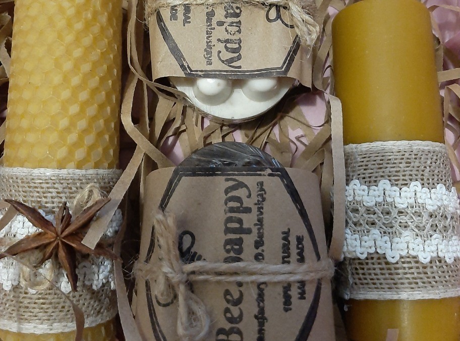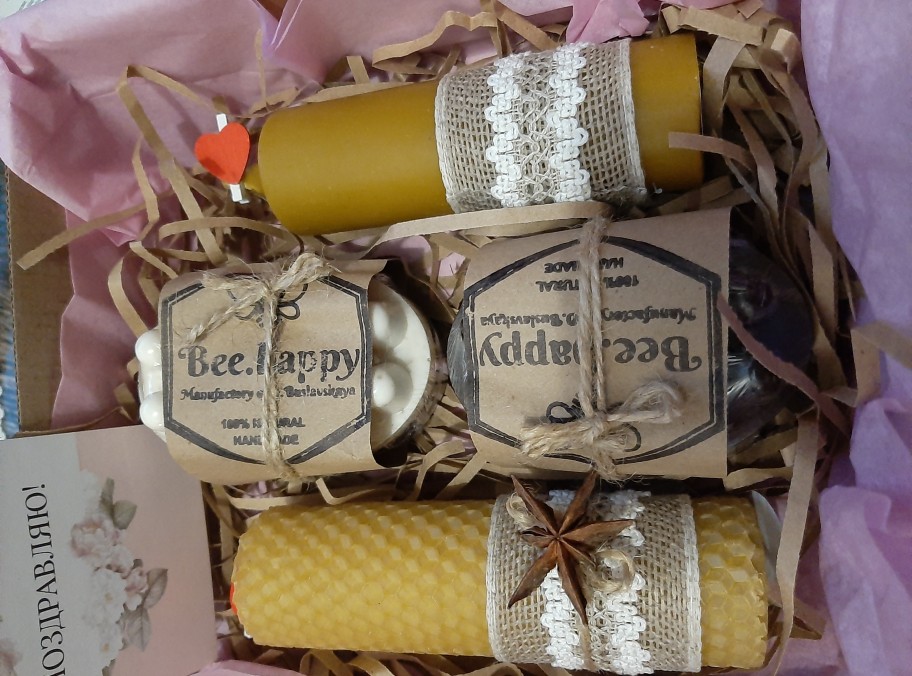 В составе подарочного bee.boxa два массажных медовых мыла, две ароматные медовые свечи 30х120 мм,открытка. Крафтовая упаковка подчеркивает натцральность вложенной продукции и придаёт подарочному набору привлекательный и стильный вид.