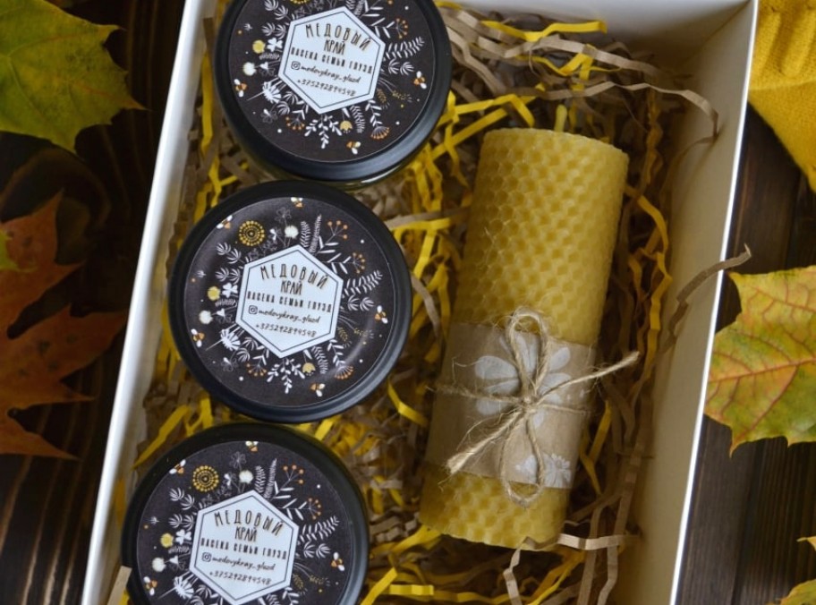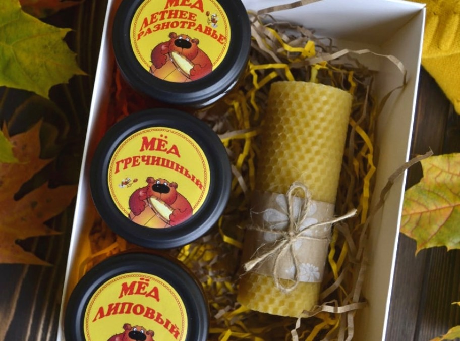 1). 3 вида мёда и свеча 13*5см.
