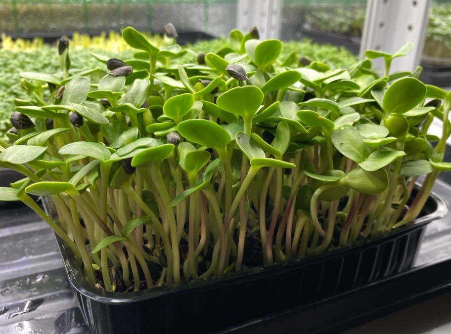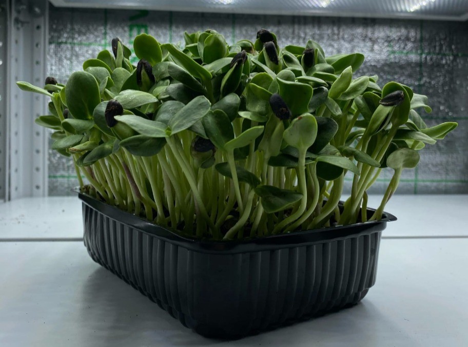 Растущая микрозелень подсолнечника в боксе размером 12см на 17см