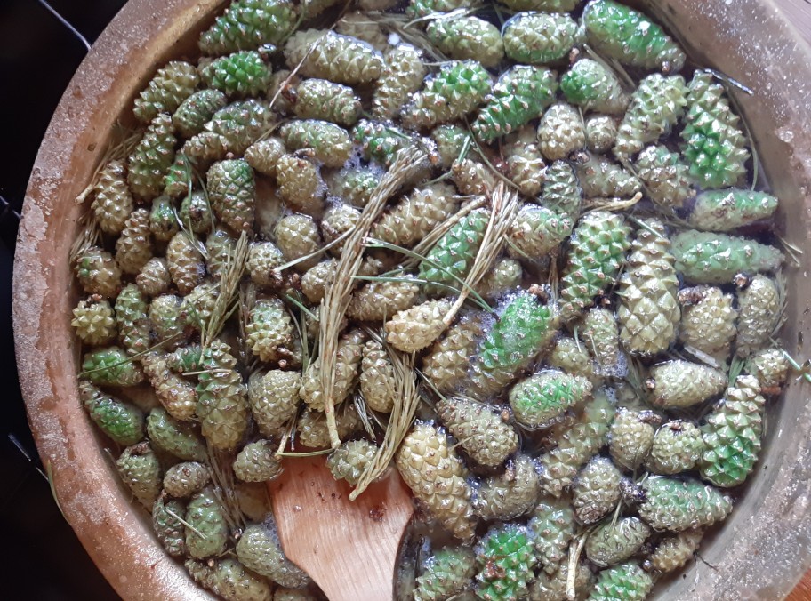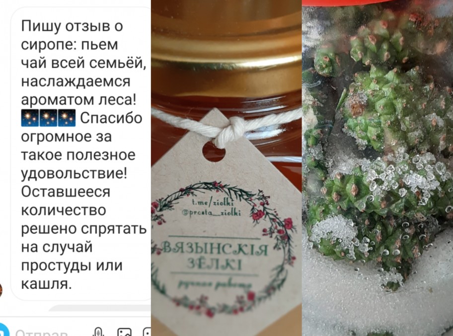 Сосновый сироп . Сварен на сахаре из шишек сосны, из шишек сосны с добавлением зубровки, чабреца, хвои, подорожника. В наличии также сироп из пыльцы.